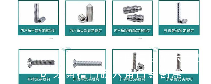 (鐵板牙自攻螺絲) B-2: Plastic Tapping Screw. (塑膠用,自攻螺絲) C: Wooden Screw : 木工螺絲 D: Drywall Screw :水泥墻螺絲 E: Self Drilling Screws鉆尾螺絲(不銹鋼鉆尾螺絲,復合材料鉆尾螺絲) F:膨脹螺絲,四片膨脹螺絲又
